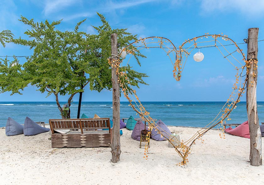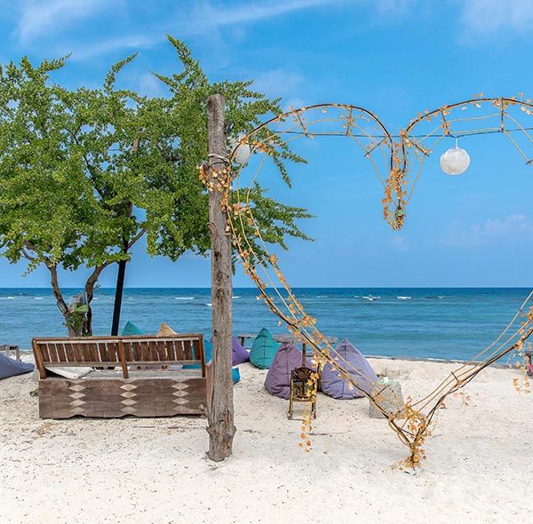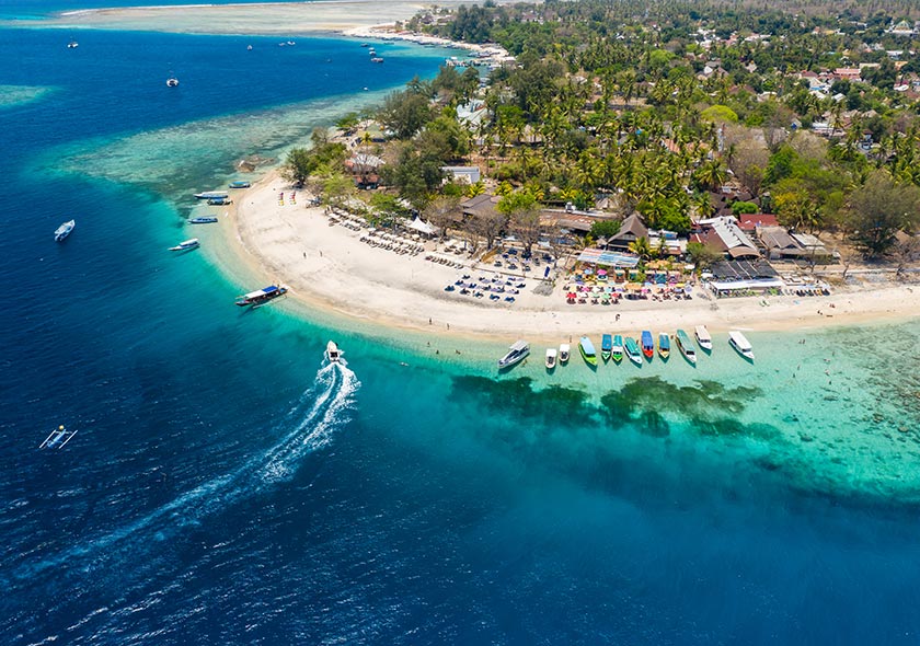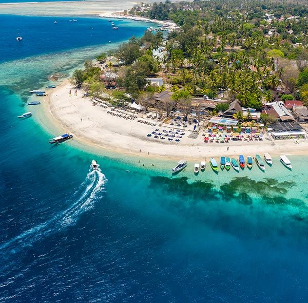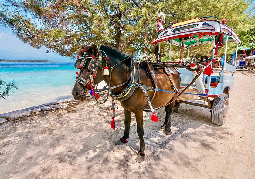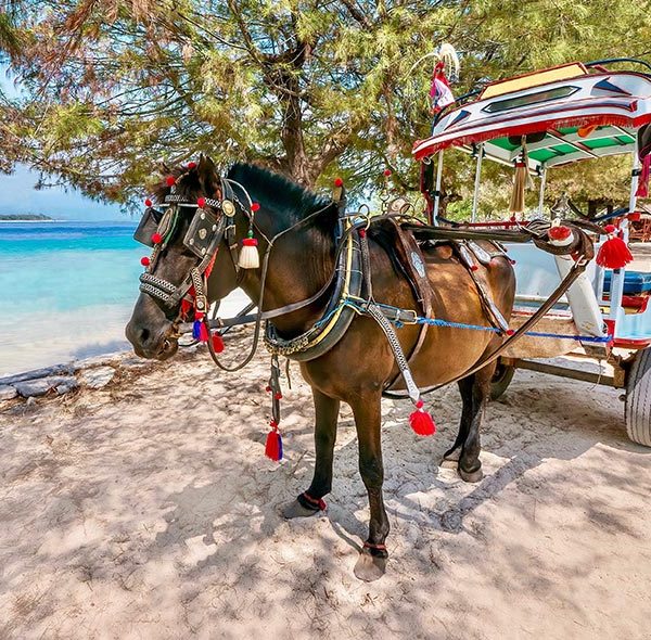 Les trois iles Gilis dans la mer de Bali, une eau cristalline, endroit insolite encore préservé du tourisme de masse. Sur ces Iles, les véhicules motorisés sont interdits. La visite des trois iles est accessible en taxi bateaux. L’île la plus animés est Gilis Trawagan.